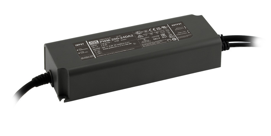 Egykimenetes, dimmelhető, műanyag tokozott DALI 2 LED tápegység, IP67 Vin: 90-305 VAC/127-431 VDC, Vout: 24VDC / 8.3A, P: 199,2W, 195*68*39.5mm (L*W*H)
